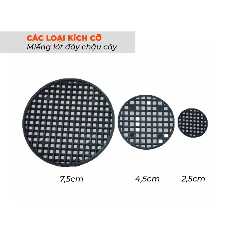 THÔNG TIN SẢN PHẨM --- - Tên hàng: Miếng lót đáy chậu cây lưới tròn thoát nước, ngăn đất rơi ra ngoài - Mã hàng: DCK-20 - Xuất xứ: Việt Nam - Quy cách: Set 10 cái - Hướng dẫn sử dụng: Sản phẩm được sử dụng để đặt dưới đáy chậu gốm hoặc chậu hoa có lỗ nhỏ. Miếng lót chậu bằng nhựa này có thể ngăn đất rò rỉ ra ngoài và thông gió. - Màu sắc: Đen - Chất liệu: Nhựa - Các loại kích cỡ: + Loại nhỏ: 2,5x2,5x0.15 cm + Loại vừa: 4.5x4.5x0.16 cm + Loại lớn: 7.5x7.5x0.18cm